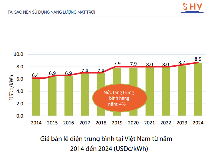 Trước hết, giá điện tại Việt Nam tăng đều đặn mỗi năm, gây áp lực kinh tế lớn cho người tiêu dùng và doanh nghiệp. Việc đầu tư vào năng lượng mặt trời giúp giảm phụ thuộc vào nguồn điện truyền thống và giảm chi phí điện lâu dài.